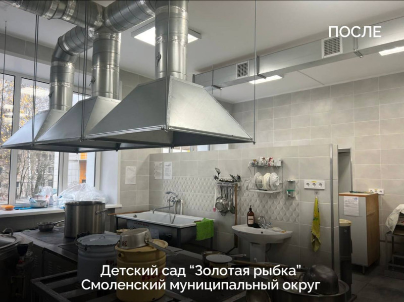 Пищеблок: Кухонное помещение прошло полный капитальный ремонт. Монтаж современной вентиляции обеспечит комфортные условия труда для наших поваров и гарантирует соблюдение высочайших гигиенических норм при приготовлении пищи для детей.