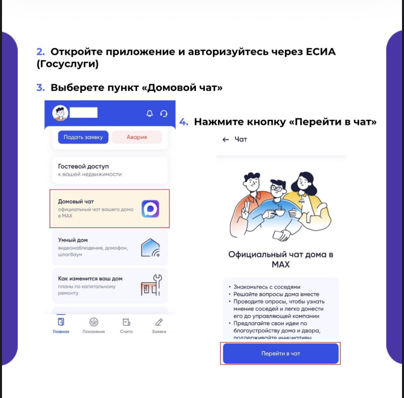 Через приложение «Госуслуги.Дом»: установите приложение, откройте главную страницу и нажмите кнопку «Домовой чат» — вы автоматически перейдёте в официальный чат вашего дома в МАХ.