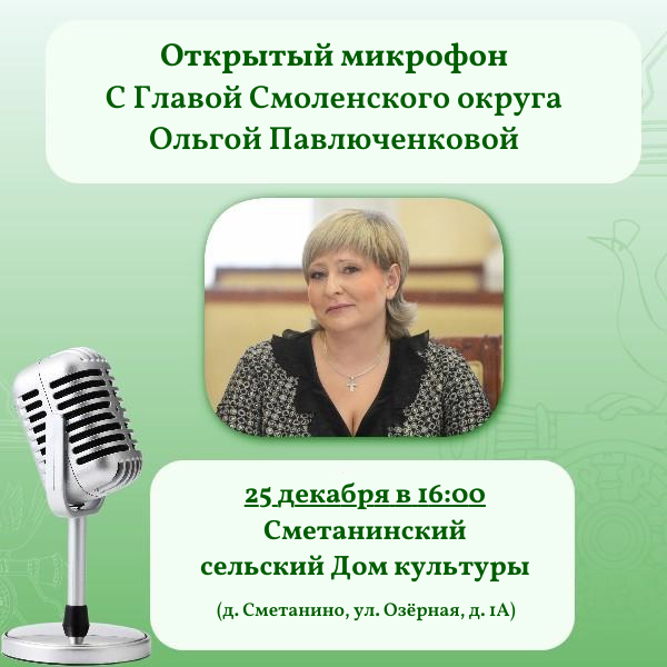 25 декабря 2025 года в 16:00 в Сметанинском сельском Доме культуры, расположенном по адресу: Смоленский округ, д. Сметанино, ул. Озёрная, д. 1А, состоится встреча Главы Смоленского муниципального округа Ольги Павлюченковой с жителями Смоленского округа в формате «открытый микрофон».
