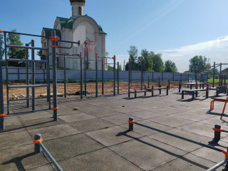 Площадка имеет размер 10х20 метров, на которой уложена специальная резиновая плитка для безопасности использования и установлен комплект спортивного оборудования из 21 спортивного тренажера.