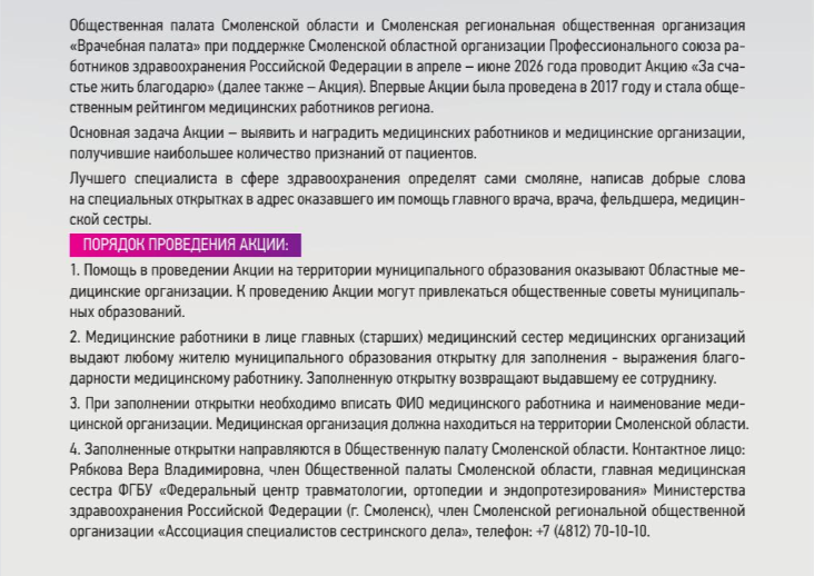 С 1 апреля по 30 июня 2026 года в Смоленском муниципальном округе проходит акция «За счастье жить благодарю». Цель акции – составить общественный рейтинг медицинских работников и организаций на основе благодарностей от пациентов. Лучших врачей, фельдшеров, медицинских сестёр и главных врачей, получивших наибольшее признание, наградят.