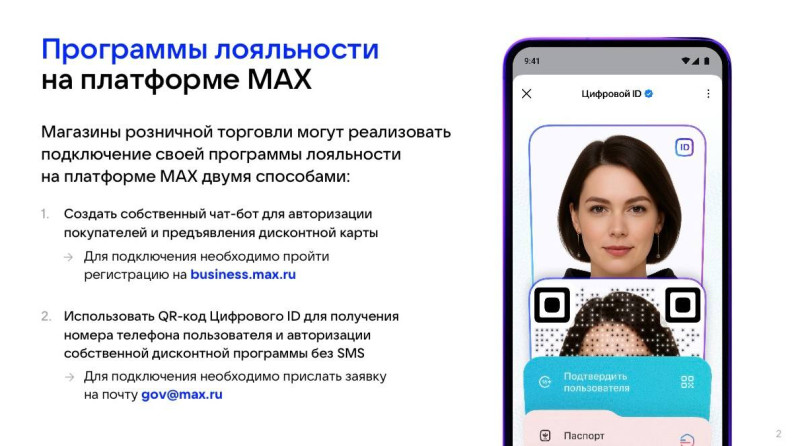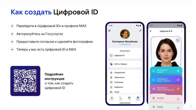 Цифровой ID — это способ подтвердить сведения о себе, используя доверенное фото и уникальный идентификатор без передачи персональных данных. Для подтверждения возраста пользователю необходимо пройти три этапа: создать, предъявить и проверить Цифровой ID. Проверка происходит через приложение «Госуслуги» с помощью сервиса «Госкан» или на кассах самообслуживания. Для подтверждения возраста пользователю нужно в приложении MAX перейти на вкладку «Профиль», выбрать «Цифровой ID» и показать созданный QR-код для считывания.