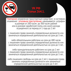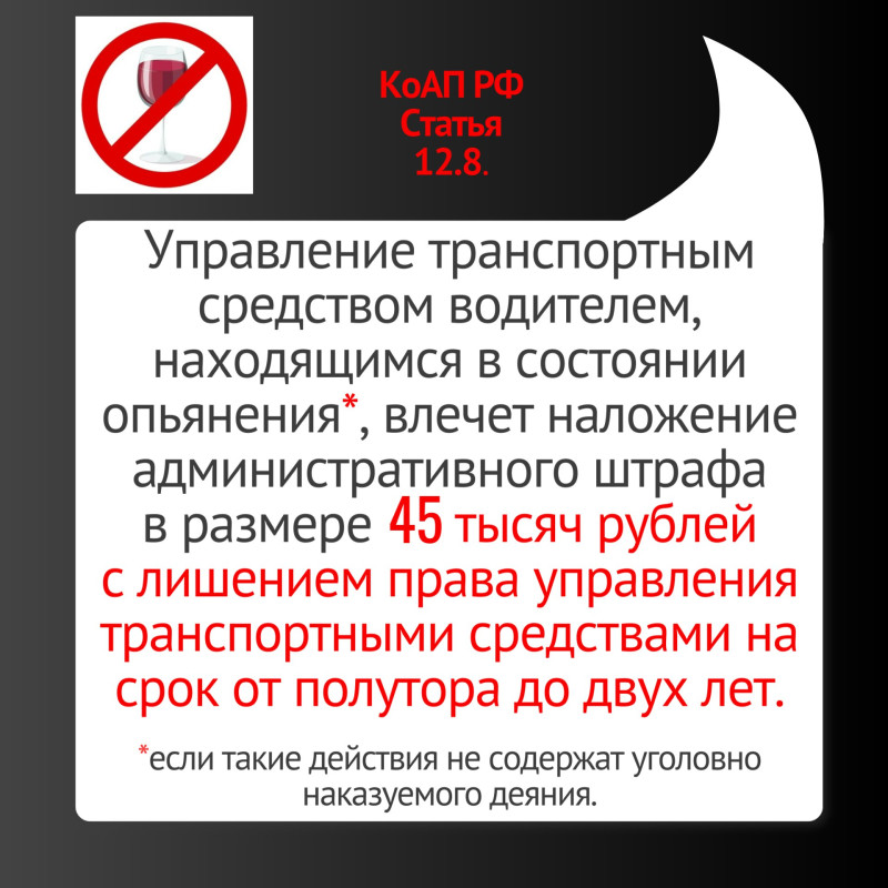 Напоминаем, что управление транспортным средством водителем, находящимся в состоянии опьянения, влечет за собой административную, а в ряде случаев - уголовную ответственность!